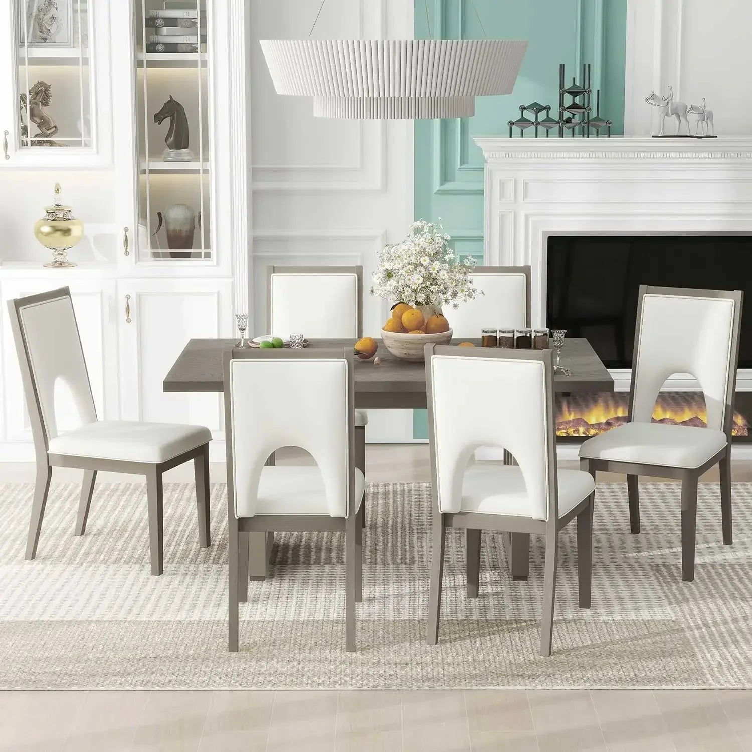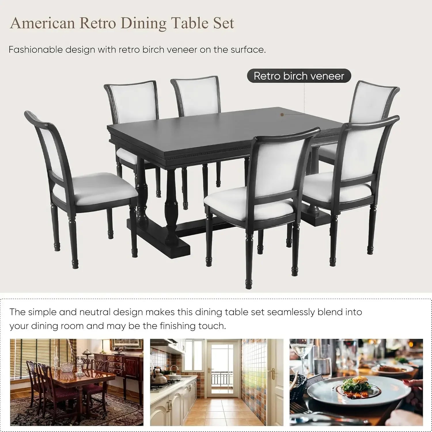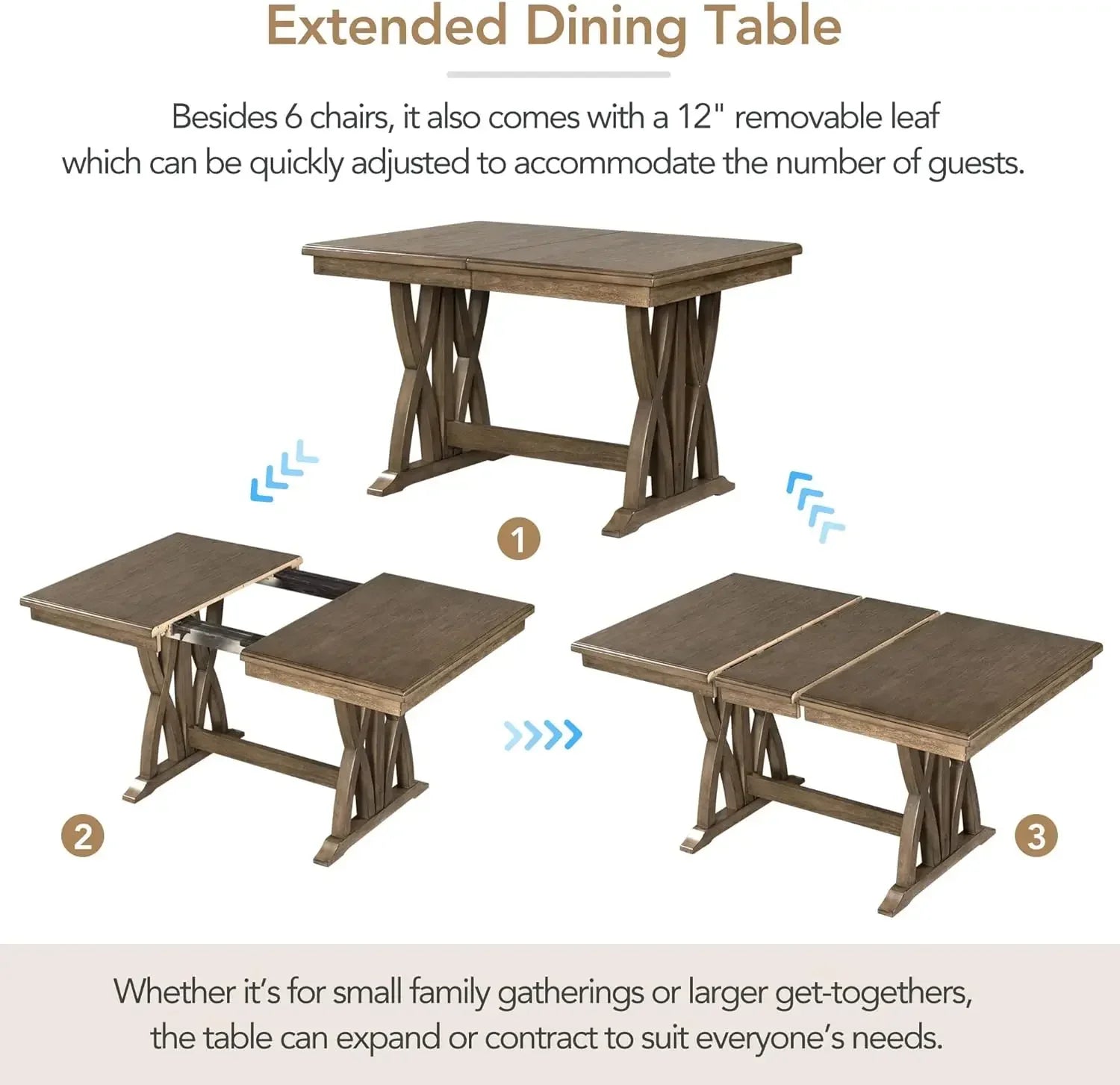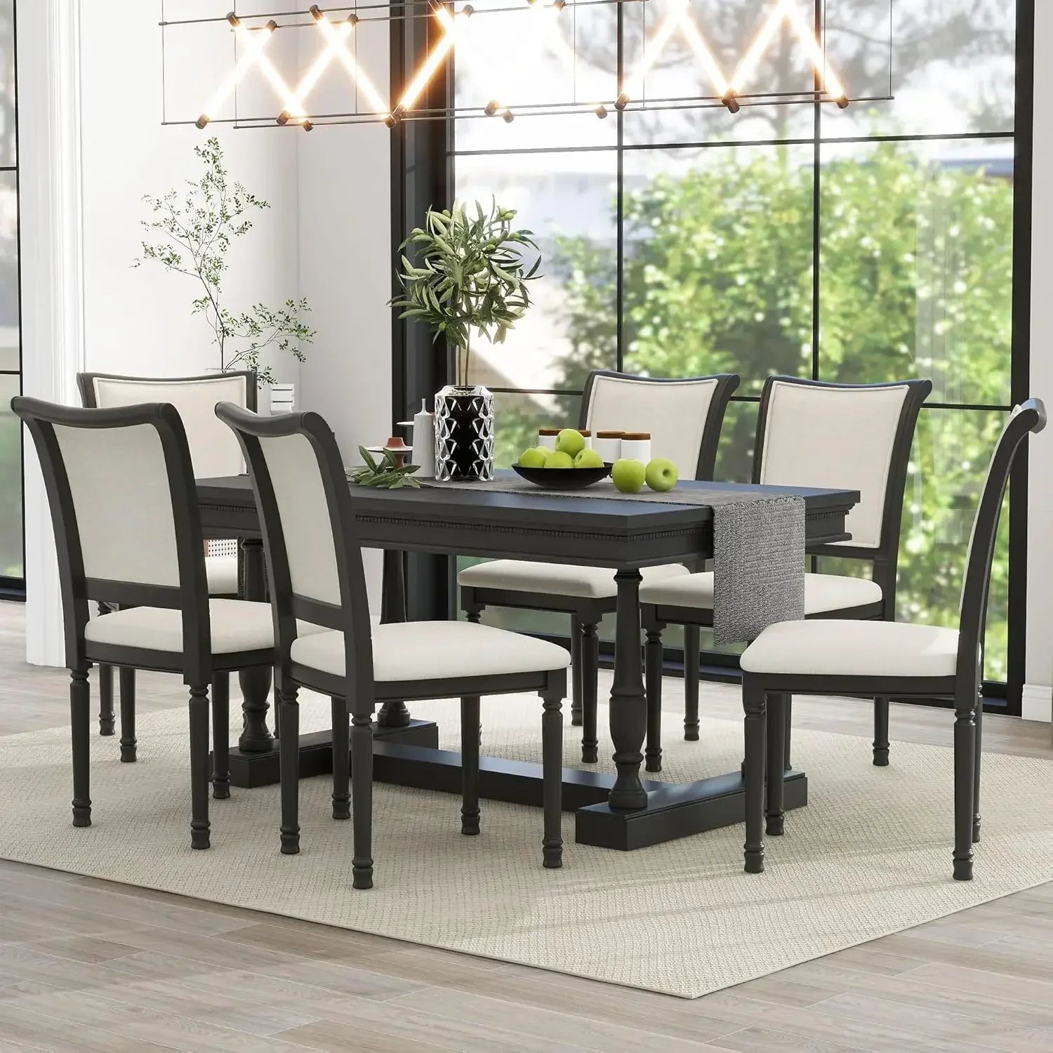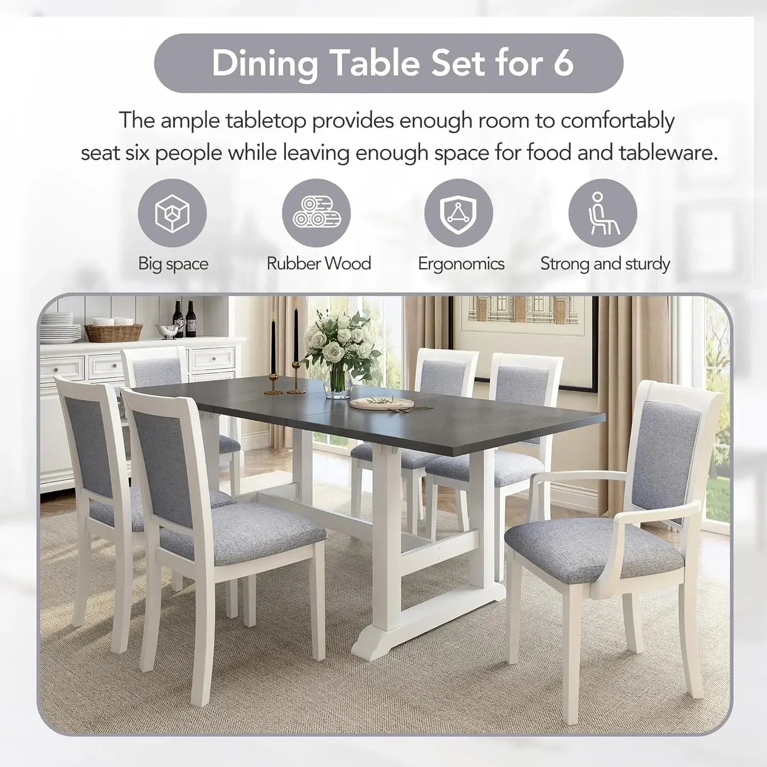 7-Piece Kitchen Dining Table Set for 6, Wood Kitchen Table and 6 Upholstered Chairs with Backrest